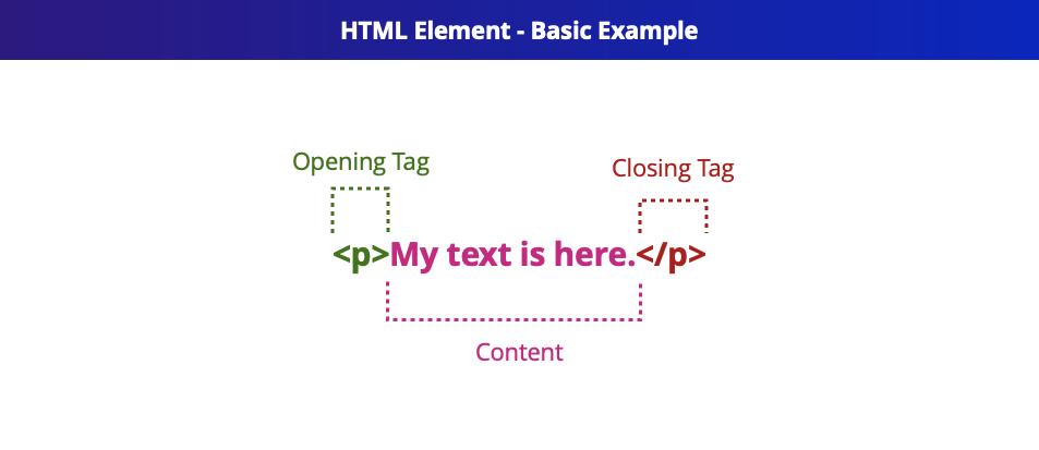 Example of basic <p> tag. This tag has starting and ending tags. In this case the content is just text, but this could be anything else like other nested elements. Ending element always start with a slash.
