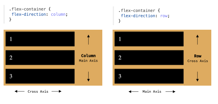By default, content inside your flexbox is spread horizontally (row). But you can change this with the flex-direction CSS property that accepts values row, row-reverse, column and column-reverse. By changing this to reverse direction, it will just reverse content directions. When referring back to the two axes, this actually changes the main axis of your flexbox. Example: