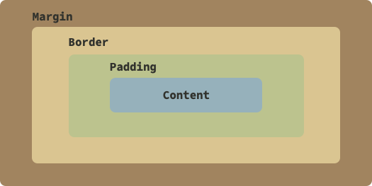 Content is your actual content in center of everything. After that you have transparent padding before the border. After padding, you have border which can be set to different kinds of colors and types. After border you have the final part margin which can be used to set transparent area outside the border.